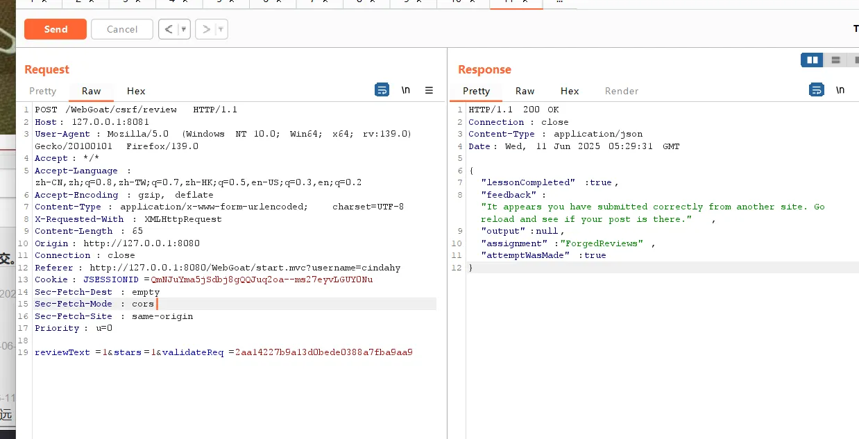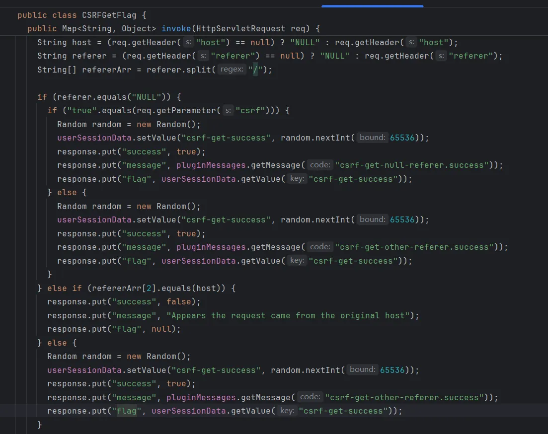 先是提交请求,对比得到这是进入第四个分支随机生成csrf-get-succcess,并把它存到了userSessionData中,并在回显中显示