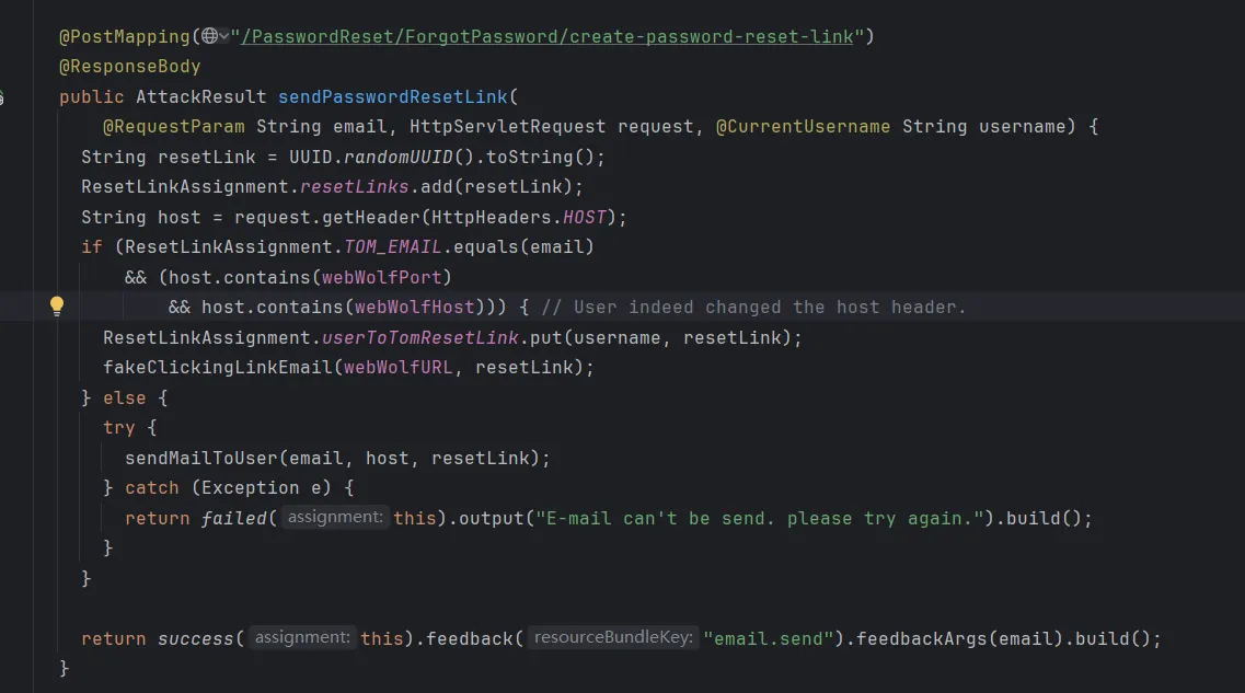 String resetLink = UUID.randomUUID().toString();:使用UUID生成随机重置令牌