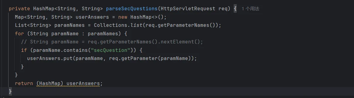 parseSecQuestions函数的作用是从请求体中遍历参数名,找到包含secQuestion的参数,将其值存入Map中并返回