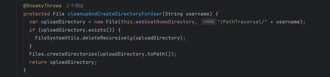 逐步解析代码,这里判断完两个参数是否为空之后,其中cleanupAndCreateDirectoryForUser为特定用户清理并创建上传目录,大意是根据webgoat的主目录和用户名拼接好路径之后,检查此路径是否为空,若不为空则调用FileSystemUtils.deleteRecursively()递归删除整个目录。(确保每次都是全新的空目录),最后返回路径