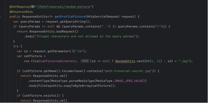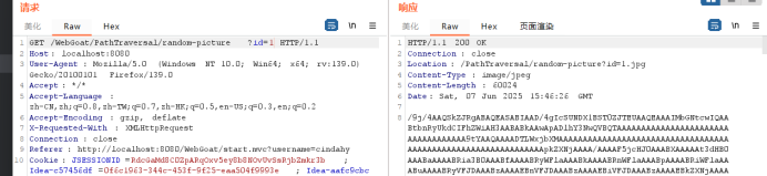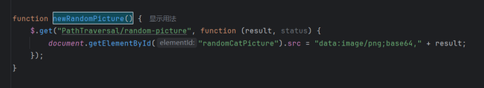 PathTraversal/random-picture。function (result, status) { ... }是一个 AJAX 回调函数,用于处理从服务器返回的响应result:后端返回的响应内容status:请求的 HTTP 状态(如"success"、"error"),但在此函数中未使用,因为$.get()仅在成功时触发该回调。randomCatPicture:前端<img>元素的 ID,函数会将 Base64 数据直接赋给它的src属性,实现图片动态加载。