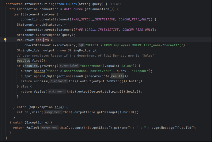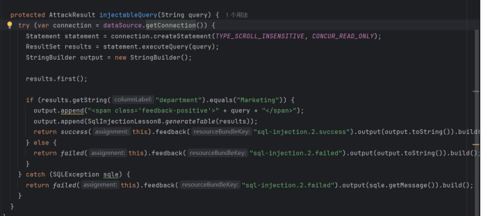 dataSource.getConnection从数据源获取一个数据库连接connection.createStatement(TYPE_SCROLL_INSENSITIVE, CONCUR_READ_ONLY):创建一个Statement对象,用于执行SQL语句。TYPE_SCROLL_INSENSITIVE表示结果集可以滚动,CONCUR_READ_ONLY表示结果集是只读的。statement.executeQuery(query):执行传入的SQL查询语句,返回一个ResultSet对象,包含查询结果。results.first():将结果集的游标移动到第一行,如果结果为空,抛出SQLExcepion错误之后就是查询结果与Marketing比对,如果正确返回正确信息(包括查询语句和查询结果)