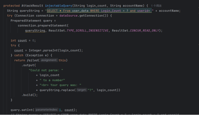 String query = "SELECT * FROM access_log WHERE action LIKE '%" + action + "%'";注意到这里用了LIKE操作符进行模式匹配