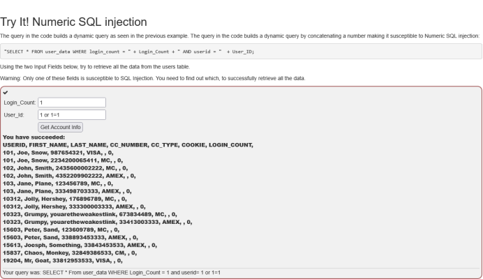 USERID, FIRST_NAME, LAST_NAME, CC_NUMBER, CC_TYPE, COOKIE, LOGIN_COUNT,