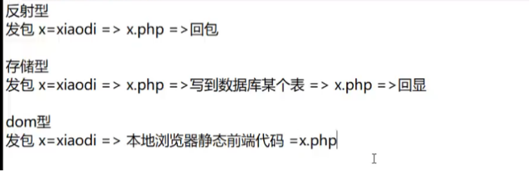Dom:前端,html静态语言Dom树,用js代码进行处理,可以直接看源码分析是否有漏洞