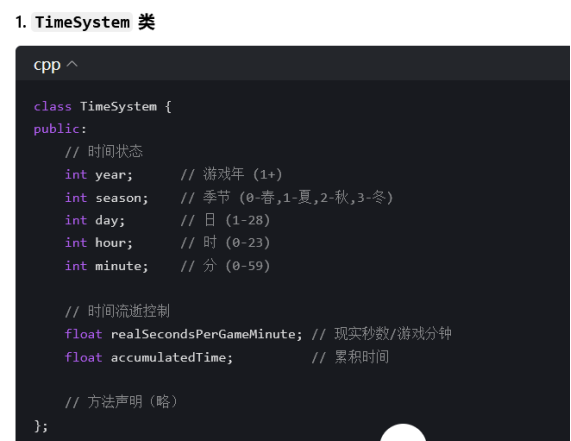 o 将游戏拆分为存档(GameSaveManager)、时间(TimeSystem)、背包(Inventory)、NPC 等模块,各模块通过头文件依赖实现低耦合。