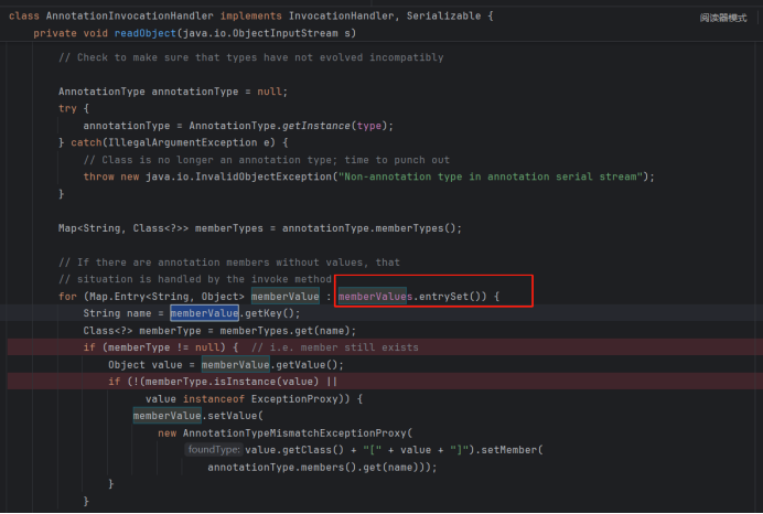 在这里调用了entrySet()方法,也就是说,如果我们将 memberValues 的值改为代理对象,当调用代理对象的方法,那么就会跳到执行 invoke() 方法,最终完成整条链子的调用。