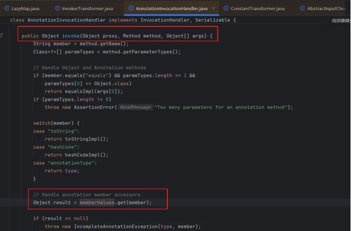 然后在AnnotationInvocationHandler类中找到了get方法的使用,其中get方法还是在invoke方法里