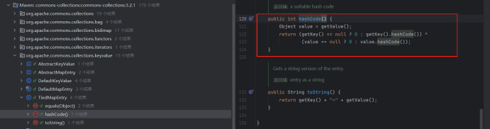 到此为止确定了TiedMapEntry链子的可用性,所以我接下来就是要找getValue的同名函数,同时由于此函数很常见,所以我们一般会优先找同一类下是否存在调用情况。
