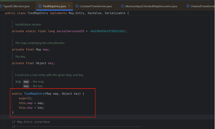 TiedMapEntry的getValue方法会调用map.get(key)方法,也就是说我们可以将构造好的lazymap的恶意内容放入到这里。