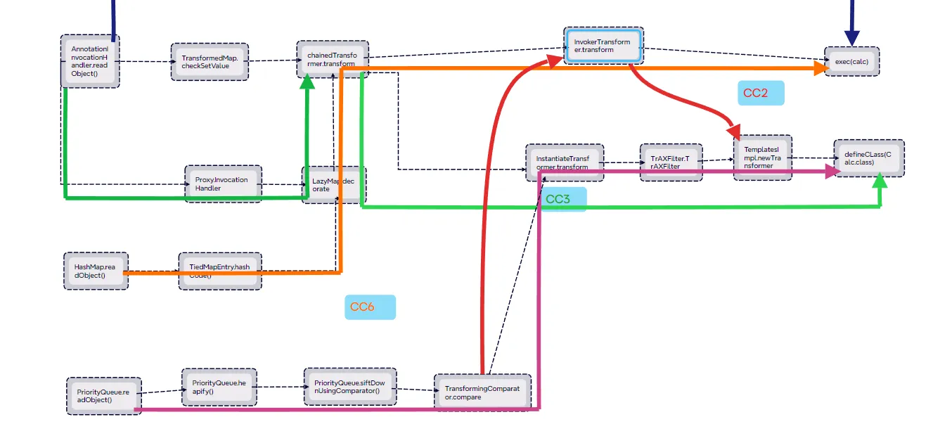 4链的基础上去除了通过InstantiateTransformer.transform调用TrAXFilter.TrAXFilte这一步骤,转而通过InvokerTransformer执行TemplatesImpl.newTransformer,从而实现加载动态加载恶意类。