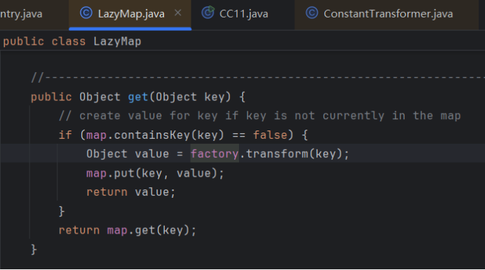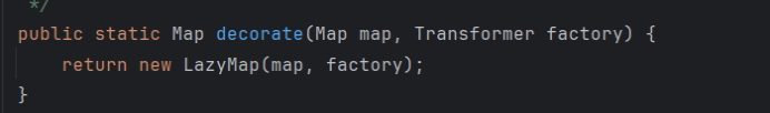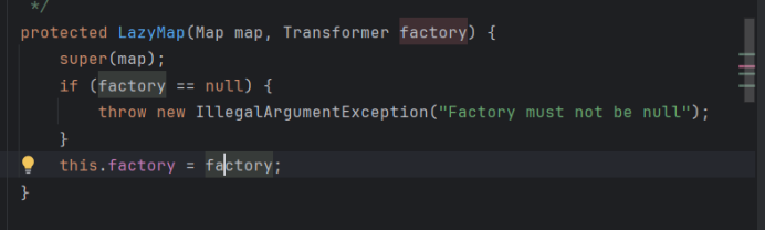 在LazyMap类中看到了这个,并且Map类也是个相当常见的类,将chainedTransformer传入LazyMap的factory,一路跟着构造的方法。