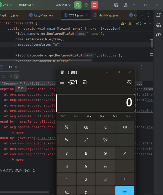 但是这里打断点调试会发现,计算器提前弹出了,打断点会发现hashMap1.put(tiedMapEntry,"value");的时候计算器就提前弹出了,这里是因为hashmap的put方法就会间接进入到链子里面。