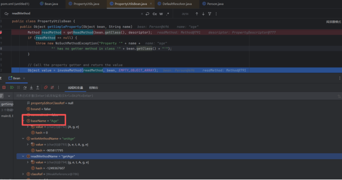 通过断点分析,我们知道,getProperty方法会将name属性值的命名结构改成驼峰格式