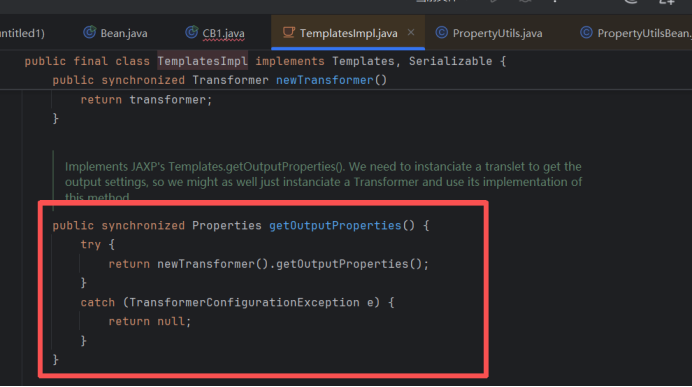 实际上 Templateslmpl类中的getOutProperties这个方法恰好符合这个结构,并且这里调用了newTransformer方法,这个方法我们在之前的链子调用中也是见过的。