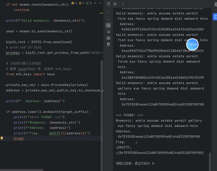 通过暴力枚举BIP-39助记词中缺失的单词,验证校验和后生成以太坊地址,直到找到以"700f80"结尾的地址作为flag。