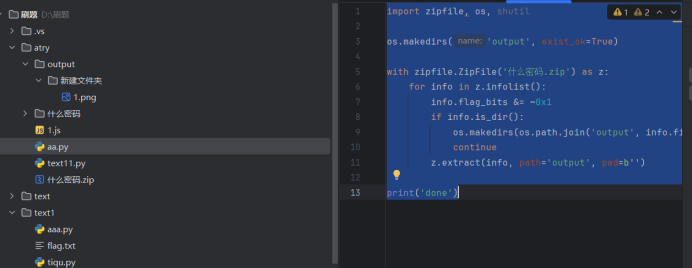 拿到一个加密的zip文件首先怀疑伪加密,用脚本把 ZIP 里“所有标记为加密”的文件强行当成没加密,直接解压到 output 文件夹。