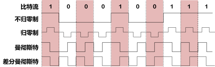 曼彻斯特编码:位周期中心的向上跳变代表 0,位周期中心的向下跳变代表 1。但也可反过来定义。