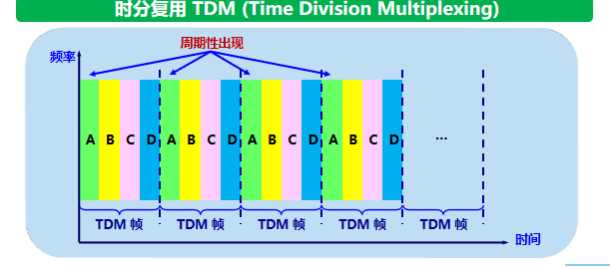 时分复用TDM:将时间划分成一段段等长的时分复用帧,每一个时分复用的用户在每一个TDM帧中占用固定序号的时隙。每一个用户所占用的时隙是周期性地出现。TDM信号也称为等时信号。所有用户在不同的时间占用同样的频带宽度。