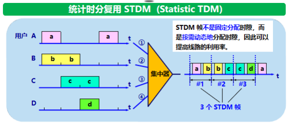 统计时分复用(STDM)Statistic TDM:STDM 帧不是固定分配时隙,而是按需动态地分配时隙,因此可以提高线路的利用率。