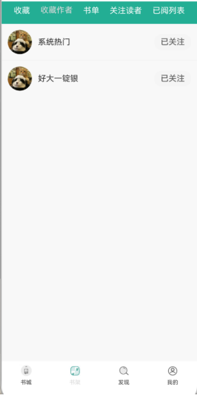(2)顶部导航栏包括收藏、收藏作者、书单、关注作者、已阅列表,点击可跳转至对应页面;