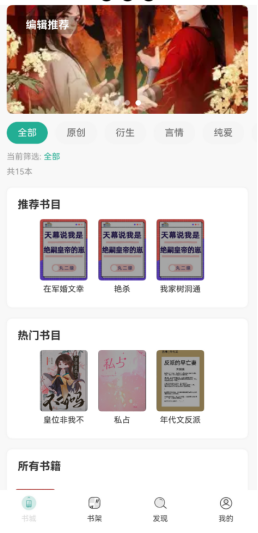 在轮播图和推荐专栏之间有一行标签筛选栏,可以点击想要的标签筛选出对应的书籍,下方小字提示筛选后的书籍数量,筛选结果显示在所有书籍专栏。