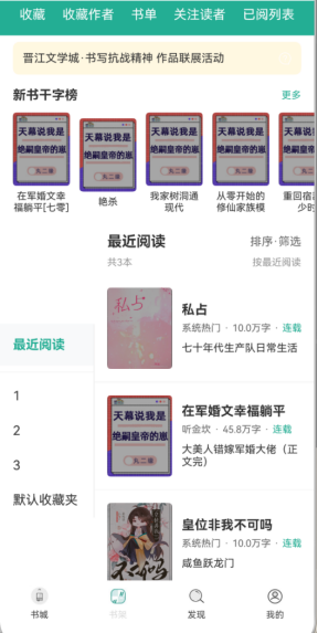 收藏板块包含收藏夹、最近阅读和新书千字榜。
