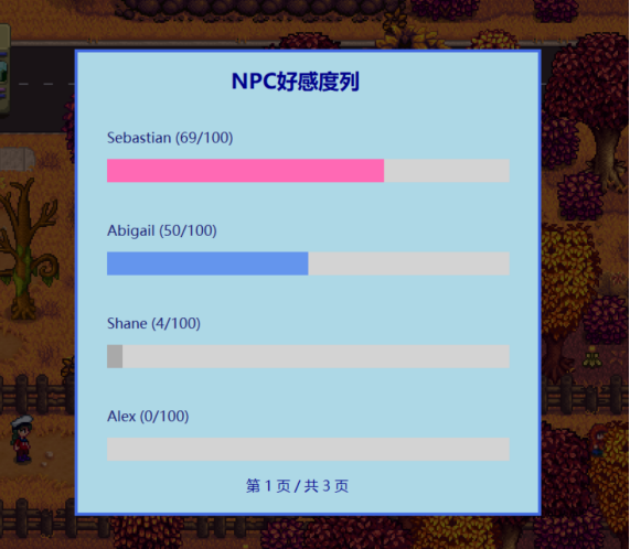 c) 人物好感界面,按g显示,左键翻面,人物好感不同,显示的颜色不同。对话和送礼都会加好感,送的礼物不同加的好感不同,讨厌的礼物会减好感。