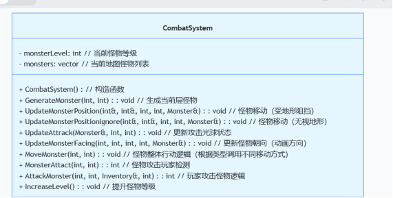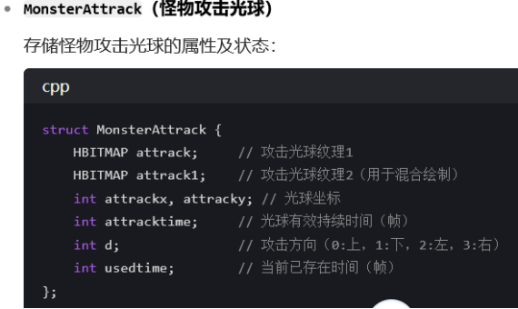 · 怪物攻击:UpdateAttrack 生成攻击光球并移动 → MonsterAttact 检测光球或怪物是否与玩家碰撞 → 返回伤害值。